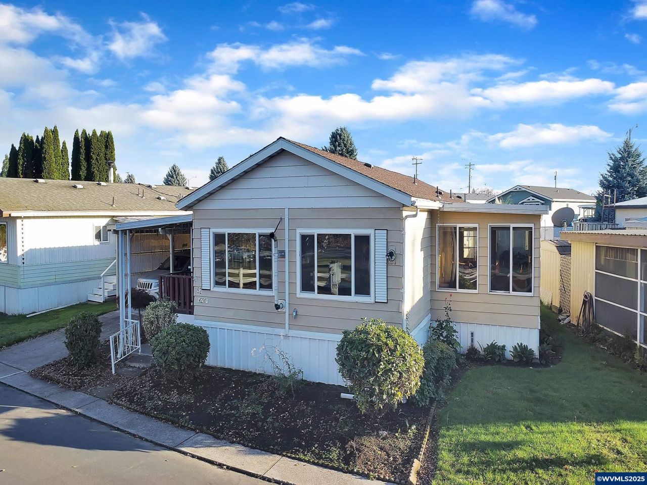 Well-Maintained Home in 55+ Park. Fresh carpet in the front room, cozy sunroom off the kitchen, all appliances included, cooking stove, microwave, dishwasher, W/D, fridge. Open flow from living room to dining area, newer pellet stove, Trane high-efficiency A/C, new water heater, vinyl windows, carport with storage, enclosed patio, wheelchair ramp. Extra outbuilding. Current space rent is $975 a month and includes water. Park approval is required.